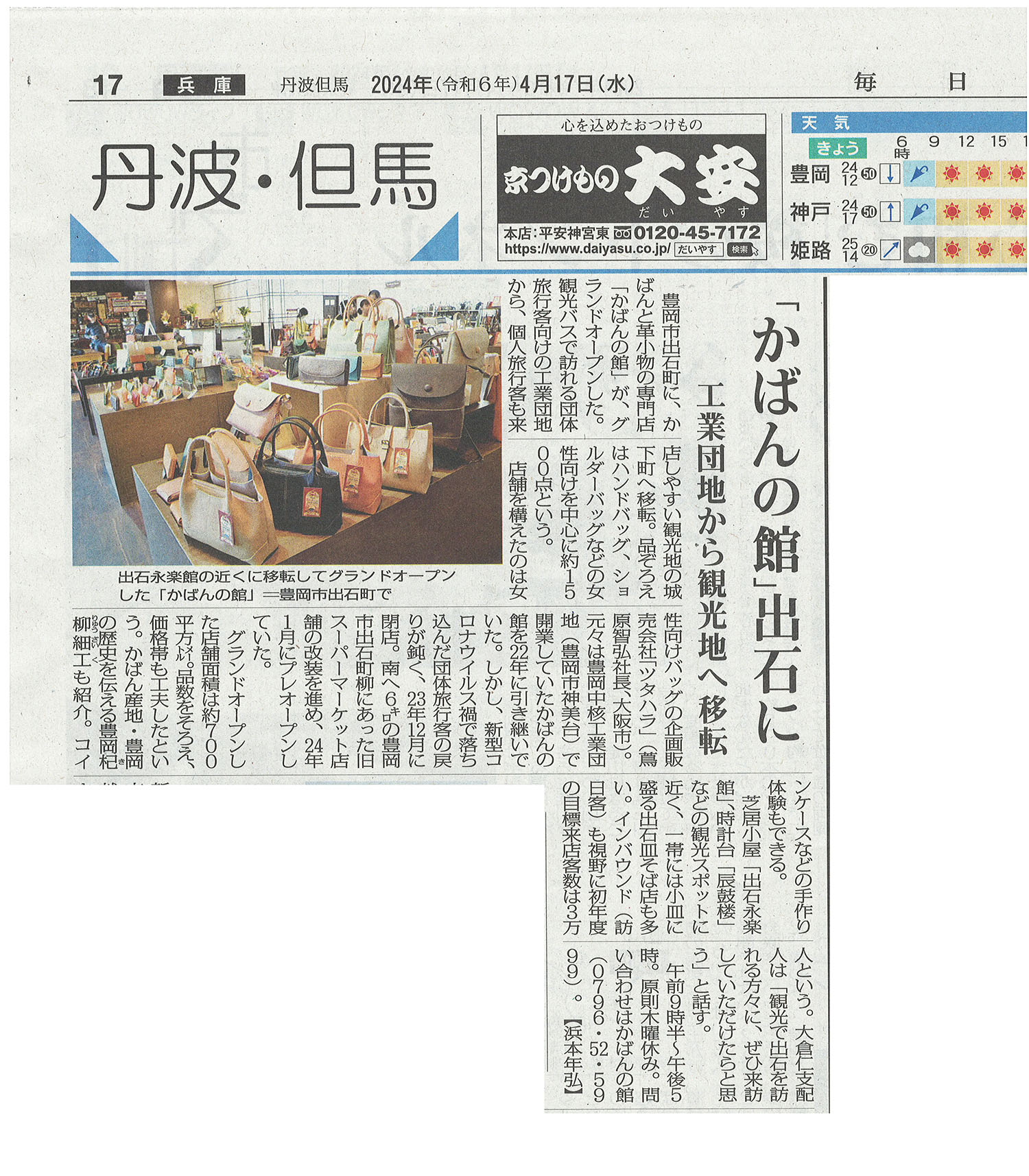2024年4月12日にグランドオープンしました弊社「かばんの館」について、下記のテレビ、新聞各紙にて紹介されました。